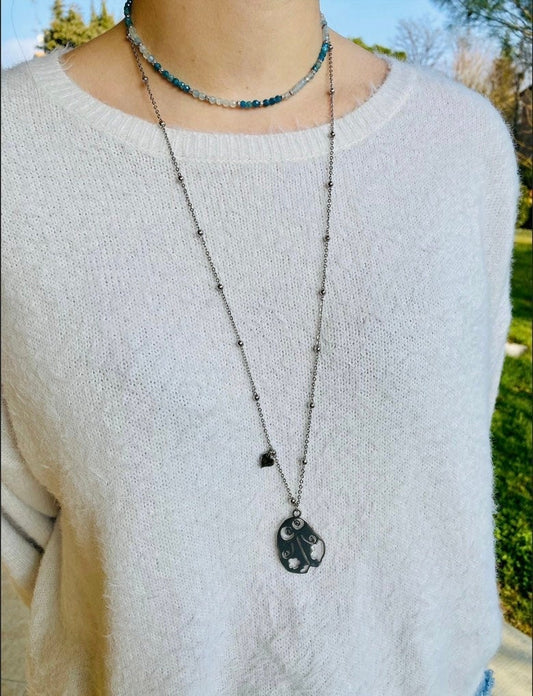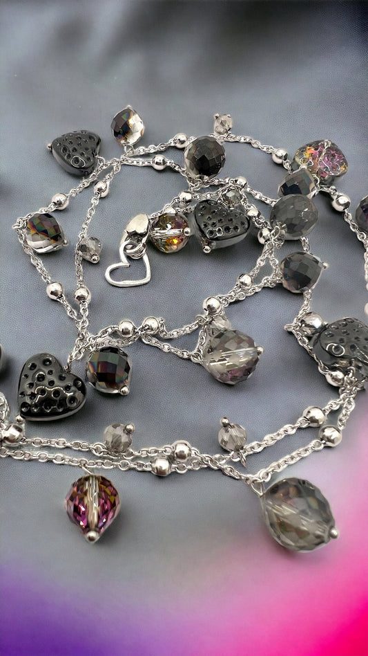 Collana lunga in acciaio diamantato, Tanzanite e corindoni rubini