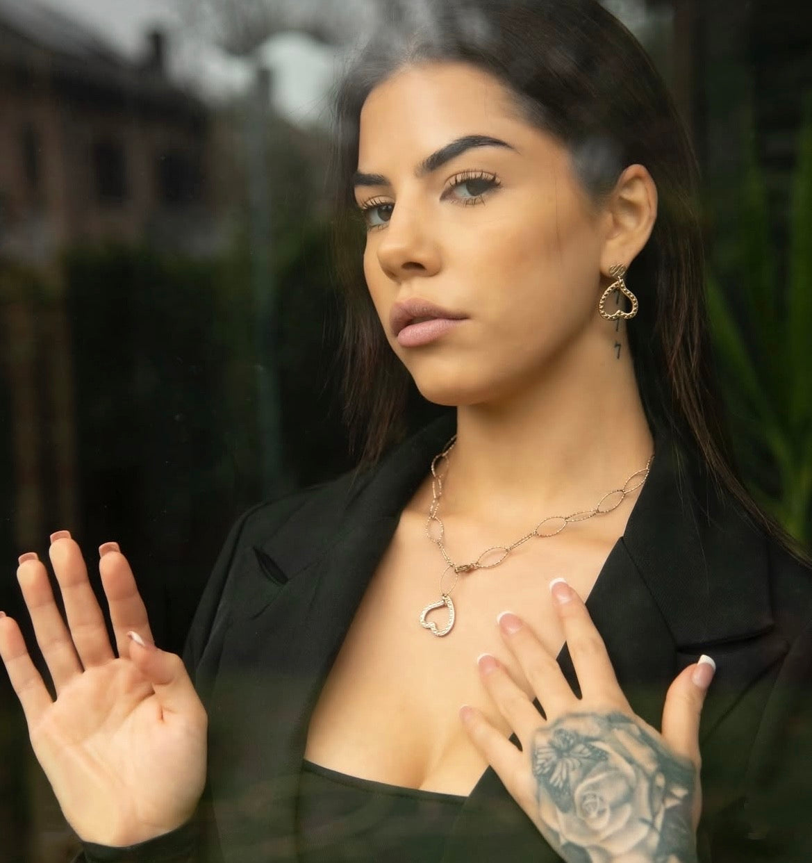 In questo scatto indossa il Girocollo Nero Luminoso con Cuore Grande e il Girocollo Nero Cuore Eterno, due pezzi che fondono romanticismo e carattere in perfetta armonia.